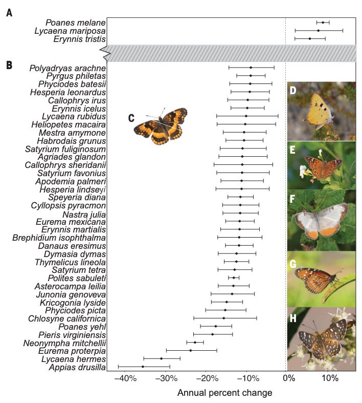 I wanted to start off my newsletter with a series of stories I wrote about the drastic decline of butterflies in the U.S. over the past 20 years, with one out of every five butterflies lost.